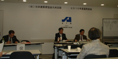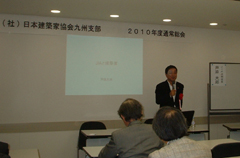 日本建築家協会九州支部の総会が福岡市のアクロス福岡で行われました。代表幹事の蓑田さんと下山、石川さんが参加しました。 支部長挨拶の後、議事に入り2010年度の事業、予算等が承認されました。 新会長の芦原太郎氏による講演会の後、ホテルに会場を変え懇親会と全国大会のアピールが行われました。