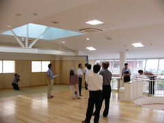 1,2階が保育室になっており、2階壁面のサッシは、開放的な空間になるように、上部が外側に傾斜しています。また、2階の保育室の床には温水式の床暖房を設置しており、暖房だけではなく、下階への遮音にも効果があるようです。