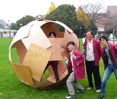 「ベニヤの家」完成: 二組の家族が参加してくれました。途中、建築家の頭の中で閃いたのか、ドームを球体にしてしまいました。