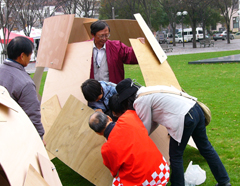 建築家協会は、市民の方々と共同で物つくりを楽しんでもらうために、ベニヤを使ったドームつくりを行いました。下記の内容が主なものです。