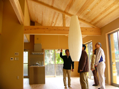 内装は、床が木製のフローリング、壁が珪藻土クロス、天井は木製の板張りとなっている。LDKの空間は一体となっているが、適度な壁で視線を遮るようになっており、勾配天井が開放的な空間を創り出している。