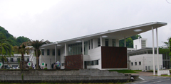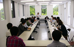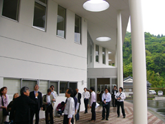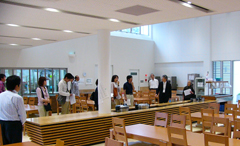 施設内の会議室で建物概要の説明 アプローチで外部の説明 アクセス道路から見た管理食堂棟の外観 食堂内部の説明