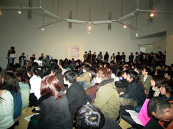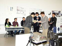九州産業大学美術館を会場として一日目は公開審査が行われた。外気温2度で雪が降るというとても3月とは思えない天候の上、会場のアートギャラリーには暖房が無かったためにかなり寒い環境ではあったが、参加した学生、クリティークそして運営スタッフの熱気が、寒さをしばし忘れさせてくれた。今回のクリティークは、非常にバラエティに富む人選となった。東京からは初期デザインレビューに参加していただいていた伊東豊雄氏と若手建築家で出版や不動産紹介などの活動も行う馬場正尊氏。福岡を代表する女性建築家の松岡恭子氏。韓国釜山から学生を引率して来ていただいた仁済大学の田采輝(Chehui