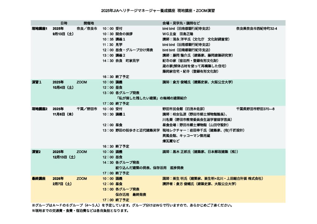 2025年度 JIAヘリテージマネージャー養成講座、現地講座・ZOOM演習のスケジュールを添付して送ります。