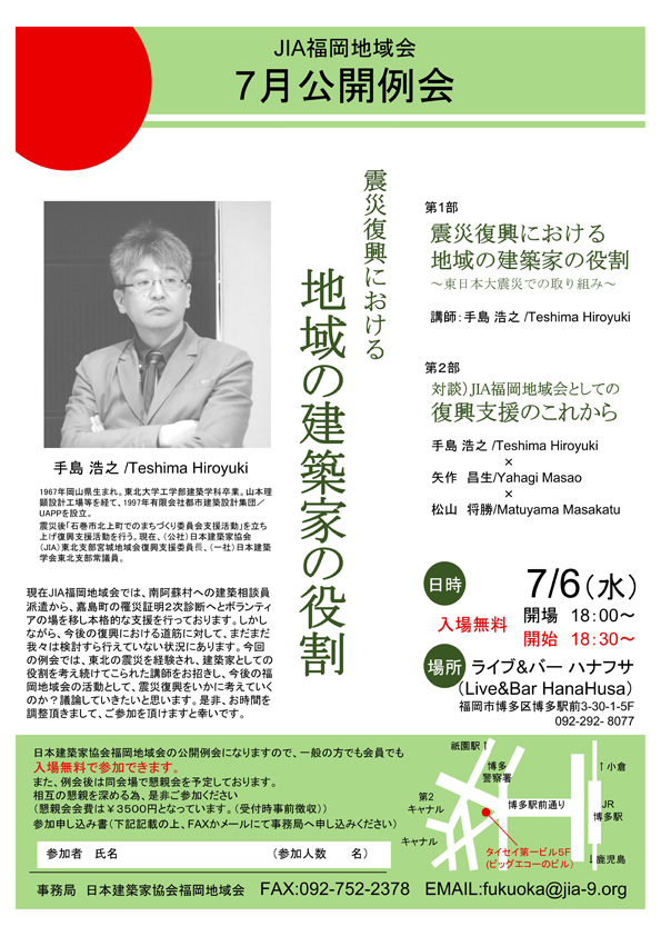 最新のお知らせ HOME › NEWS&EVENTS › 九州支部福岡地域会 › 7月公開例会:JIA福岡地域会 2016.07.06九州支部 7月公開例会:JIA福岡地域会 7月公開例会:JIA福岡地域会 日時 7月6日(水) 18:30~21:00 入場無料講師 手島浩之氏テーマ 震災復興における地域の建築家の役割 申し込み用紙に必要事項を記載の上、FAX、メールにてお申込み下さい。皆さまのお越しをお待ちしております。 (公社)日本建築家協会九州支部福岡地域会 福岡市中央区薬院1-4-8あづまビル2F tel:092-761-5267 fax:092-752-2378 mail:fukuoka@jia-9.org 各地域会のニュース 九州支部 北福岡地域会 福岡地域会 佐賀地域会 長崎地域会 大分地域会 熊本地域会 宮崎地域会 鹿児島地域会 カテゴリー CPD関連 イベント お知らせ 事業報告 見学・オープンハウス情報 アーカイブ アーカイブ 月を選択 2025年12月 2025年11月 2025年10月 2025年9月 2025年8月 2025年7月 2025年6月 2025年5月 2025年4月 2025年3月 2025年2月 2025年1月 2024年12月 2024年11月 2024年10月 2024年9月 2024年8月 2024年7月 2024年6月 2024年5月 2024年4月 2024年3月 2024年2月 2024年1月 2023年12月 2023年11月 2023年10月 2023年9月 2023年8月 2023年7月 2023年6月 2023年5月 2023年4月 2023年3月 2023年2月 2023年1月 2022年12月 2022年11月 2022年10月 2022年9月 2022年8月 2022年7月 2022年6月 2022年5月 2022年4月 2022年3月 2022年2月 2022年1月 2021年12月 2021年11月 2021年10月 2021年9月 2021年8月 2021年7月 2021年6月 2021年5月 2021年4月 2021年3月 2021年2月 2021年1月 2020年12月 2020年11月 2020年10月 2020年9月 2020年8月 2020年7月 2020年6月 2020年5月 2020年4月 2020年2月 2020年1月 2019年12月 2019年11月 2019年10月 2019年9月 2019年8月 2019年7月 2019年6月 2019年5月 2019年4月 2019年3月 2019年2月 2019年1月 2018年12月 2018年11月 2018年10月 2018年9月 2018年8月 2018年7月 2018年6月 2018年5月 2018年4月 2018年3月 2018年2月 2018年1月 2017年11月 2017年10月 2017年8月 2017年7月 2017年6月 2017年5月 2017年4月 2017年3月 2017年2月 2017年1月 2016年12月 2016年11月 2016年10月 2016年9月 2016年8月 2016年7月 2016年6月 2016年5月 2016年4月 2016年3月 2016年2月 2016年1月 2015年12月 2015年11月 2015年9月 2015年7月 2015年6月 2015年5月 2015年4月 2015年2月 2014年12月 2014年11月 2014年10月 2014年9月 2014年8月 2014年7月 2014年5月 2014年4月 2014年3月 2014年2月 2014年1月 2013年12月 2013年11月 2013年10月 2013年9月 2013年8月 2013年7月 2013年6月 2013年5月 2013年4月 2013年3月 2012年12月 2012年6月 2012年5月 2012年4月 2012年3月 2012年2月 2011年11月 2011年10月 2011年8月 2011年7月 2011年5月 2011年4月 2011年2月 2011年1月 2010年12月 2010年11月 2010年7月 2010年6月 2010年2月 2010年1月 2009年11月 2009年10月 2009年5月 2009年4月 2009年3月 2009年2月 2009年1月 2008年12月 2008年11月